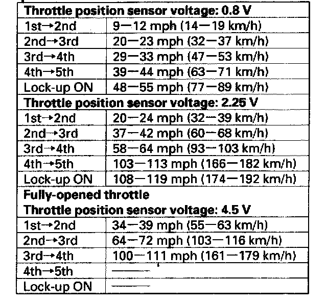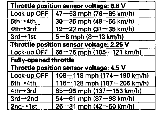 5. Test-drive the vehicle on a flat road in the D position. Check for abnormal noise and clutch slippage. While driving, check that the shift points occur at the proper speeds by monitoring the throttle position sensor voltage with the HDS and comparing your shift point speeds and voltage to those in the table. (The throttle position sensor voltage represents the throttle opening.)