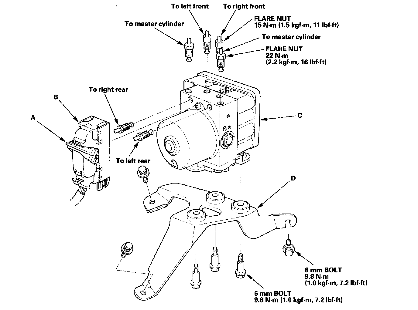 3. Remove the three 6 mm bolts, then remove the VSA modulator-control unit (C)/bracket (D) from the body.