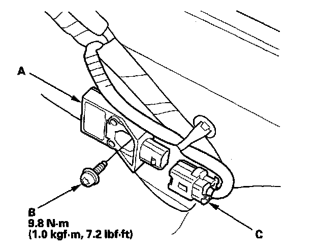 1. Install the new side impact sensor (first) (A) with a Torx bolt (B), then connect the floor wire harness 2P connector (C) to the side impact sensor (first).