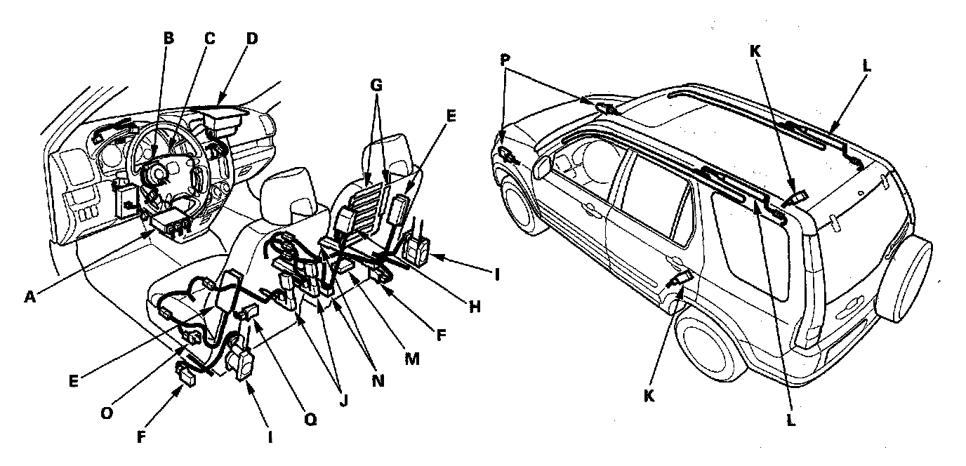 The SRS is a safety device which, when used with the seat belt, is designed to help protect the driver and front passenger in a frontal impact exceeding a certain set limit. The system consists of the SRS unit, including sating sensor and impact sensor (A), the cable reel (B), the driver's airbag (C), the front passenger's airbag (D), side airbags (E), side curtain airbags (L), seat belt tensioners (I),seat belt buckle tensioners (J), side impact sensors (first) (F), front impact sensors (P), roll rate sensor (Q) and side impact sensors (second) (K). Since the driver's and front passenger's airbags use the same sensors, both normally inflate at the same time. However, it is possible for only one airbag to inflate. This can occur when the severity of a collision is at the margin, or threshold, that the SRS unit determines whether or not the airbags will deploy. In such cases, the seat belt will provide sufficient protection, and the supplemental protection offered by the airbag would be minimal.
