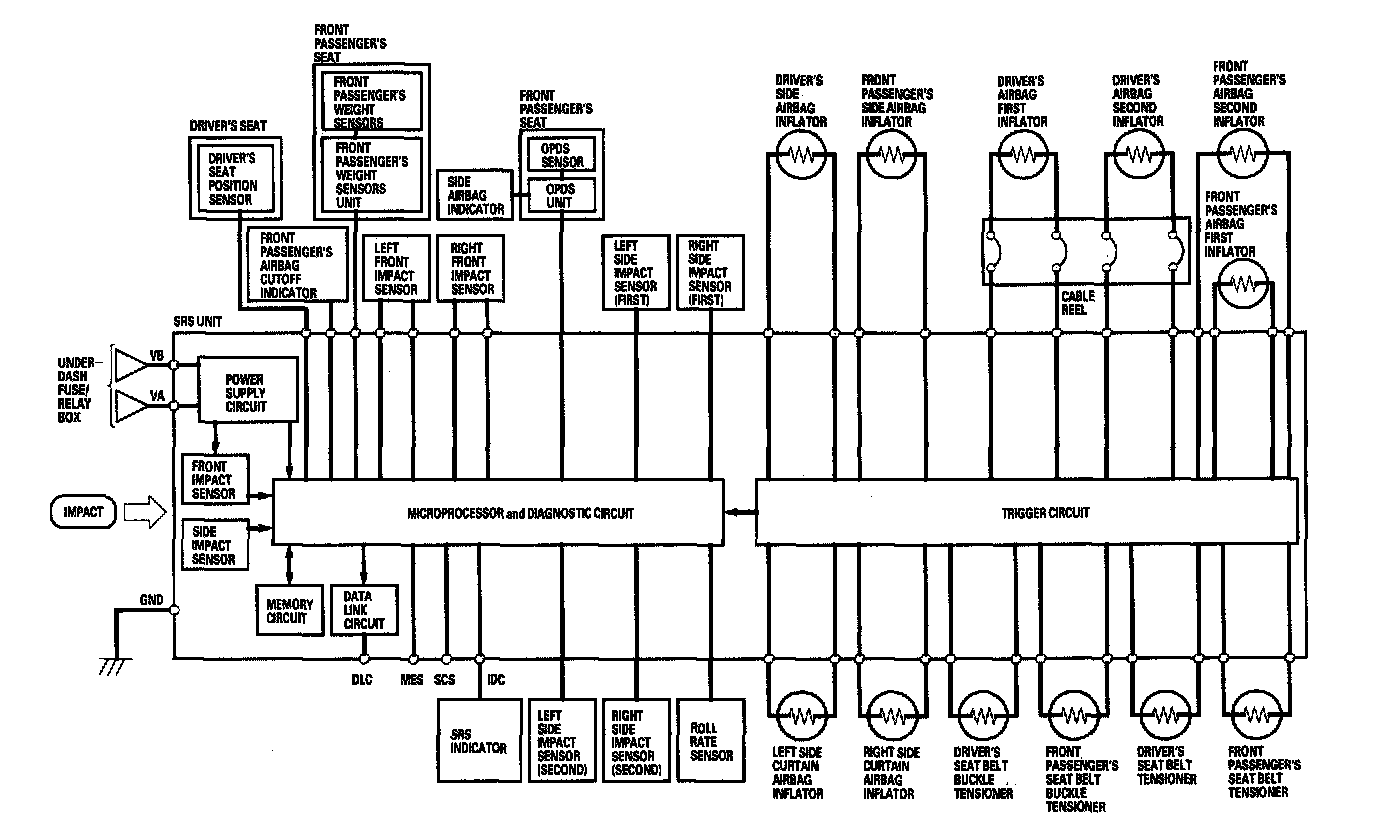 The main circuit in the SRS unit senses and judges the force of impact and, if necessary, ignites the inflator charges. If battery voltage is too low or power is disconnected due to the impact, the voltage regulator and the back-up power circuit, respectively, will keep voltage at a constant level.