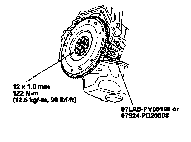 Install the special tool, then torque the flywheel mounting bolts in a crisscross pattern in several steps.
