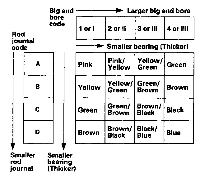 4. Use the big end bore codes and rod journal codes to select appropriate replacement bearings from the following table.