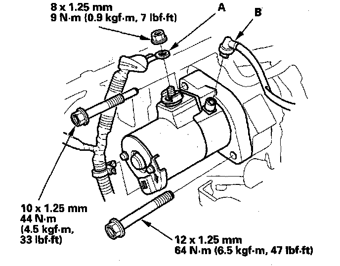 5. Disconnect the starter cable (A) from the B terminal on the solenoid, then disconnect the BLK/WHT wire (B) from the S terminal.