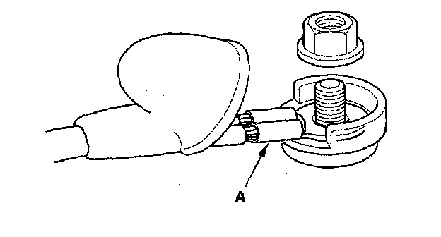 7. Install the starter in the reverse order of removal. Make sure the crimped side of the ring terminal (A) is facing out.