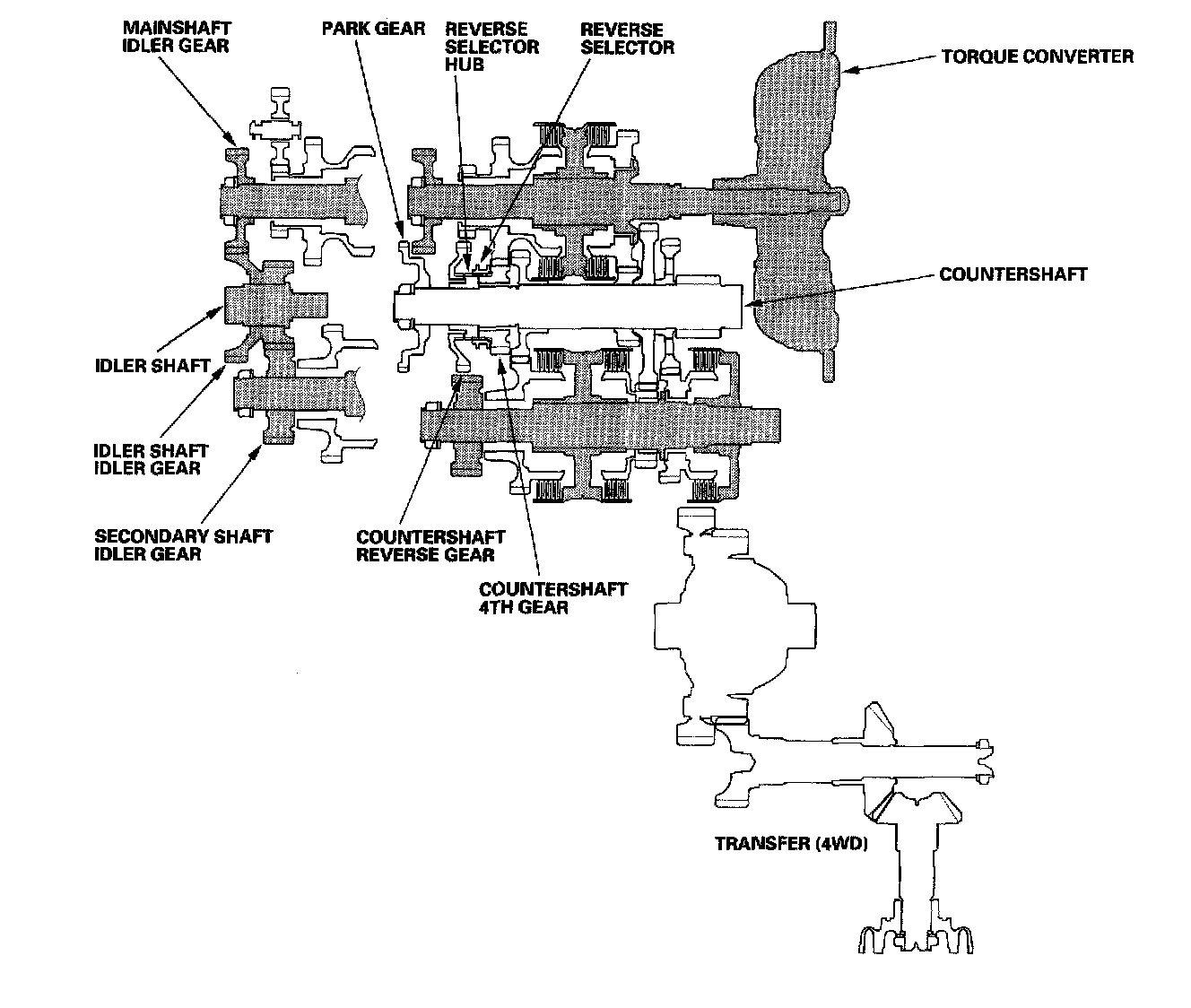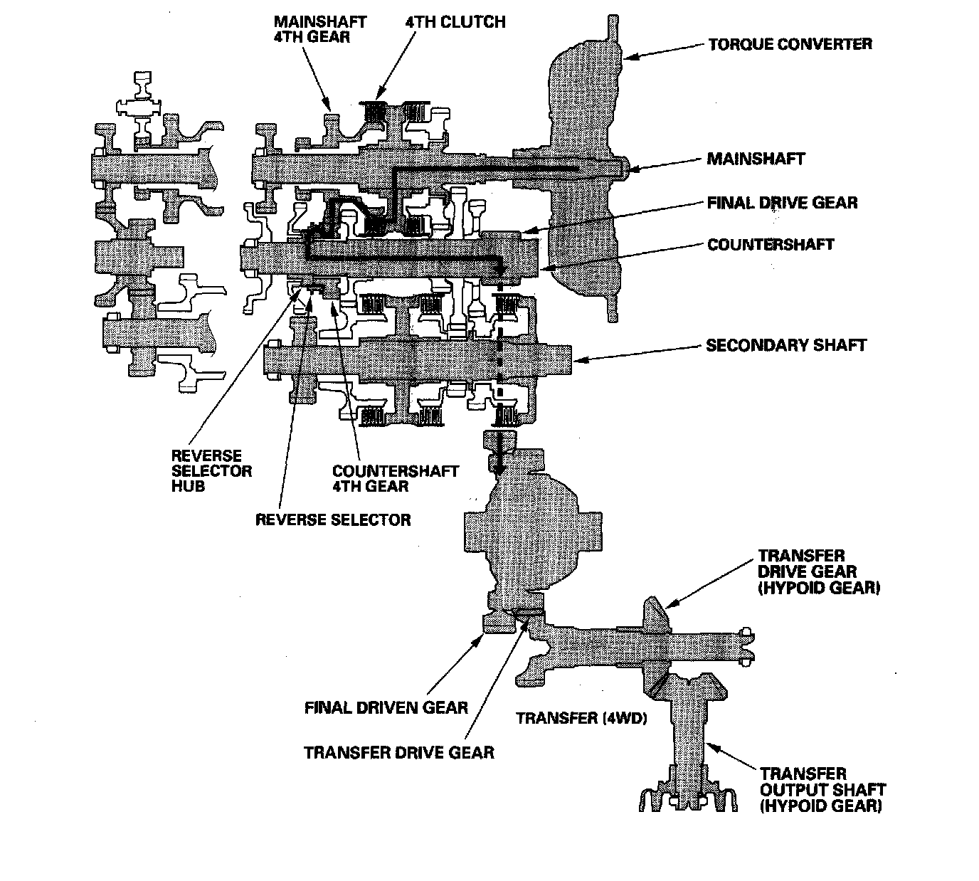 Engine power transmitted from the torque converter drives the mainshaft idler gear, the idler shaft idler gear, and the secondary shaft idler gear, but hydraulic pressure is not applied to the clutches. Power is not transmitted to the countershaft. In this position, the position of the reverse selector differs according to whether the shift lever shifted from the D or R position: