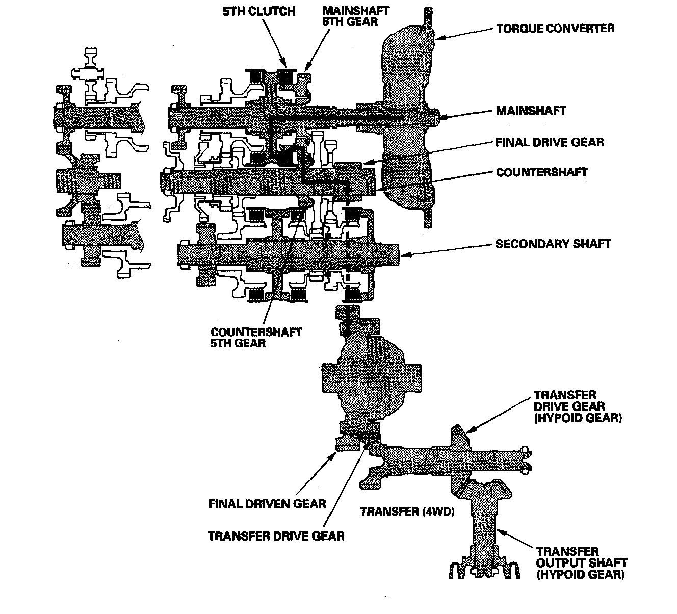 ^ Hydraulic pressure is applied to the 5th clutch, then the 5th clutch engages the mainshaft 5th gear with the mainshaft.