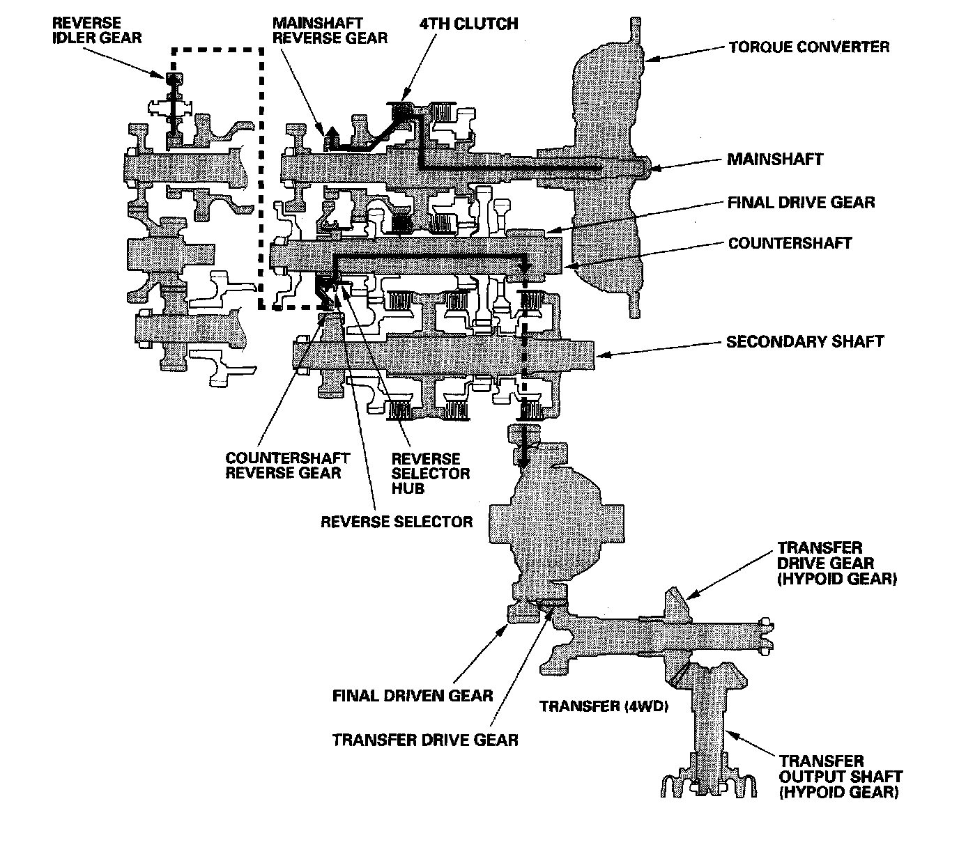 ^ Hydraulic pressure is also applied to the 4th clutch, then the 4th clutch engages the mainshaft reverse gear with the mainshaft.