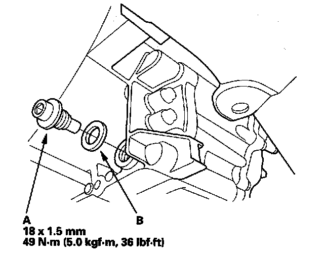 4. Remove the drain plug (A), and drain the automatic transmission fluid (ATF). Reinstall the drain plug with a new sealing washer (B).