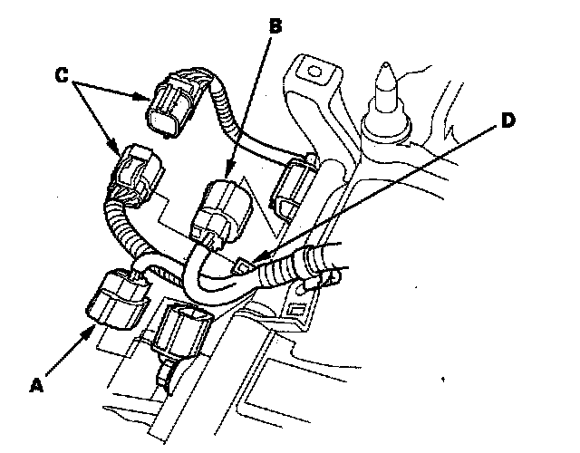 12. Remove the transmission range switch connector (C) from its bracket (D), then disconnect it.