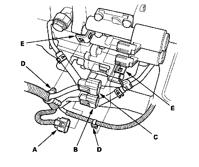 14. Disconnect the shift solenoid harness connector (A), A/T clutch pressure control solenoid valve B connector, and solenoid valve C connector, then remove the harness clamps (D) from the clamp brackets (E).