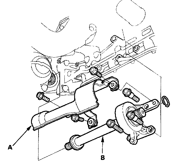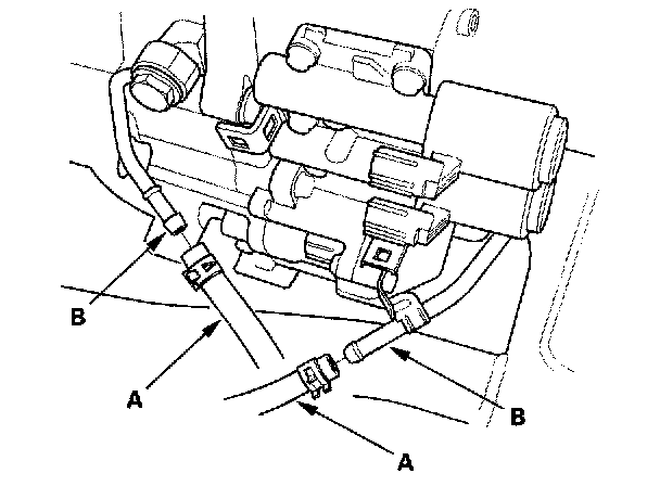 15. Remove the A/T cooler hoses (A) from the ATF cooler lines (B). Turn the ends of the ATF cooler hoses up to prevent ATF from flowing out, then plug the ATF cooler hoses and lines.