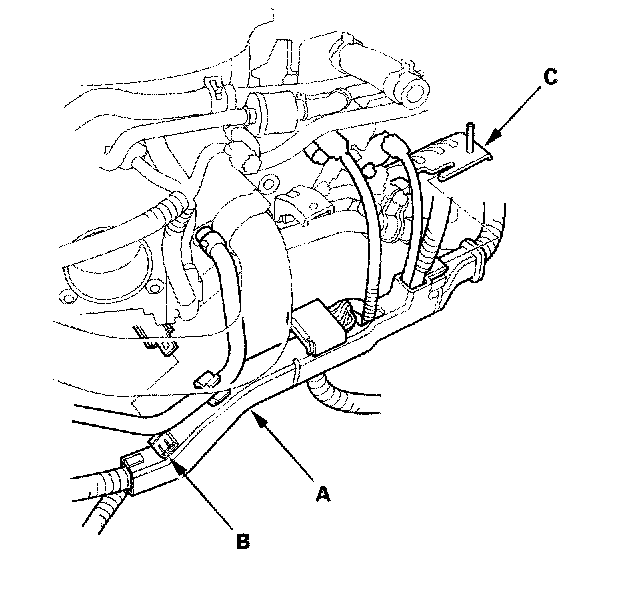 18. Remove the water pipe mounting bolt (A), and lower the water pipe slightly. Loosen the air cleaner housing bracket mounting bolt (B), and remove the mounting bolt (C).