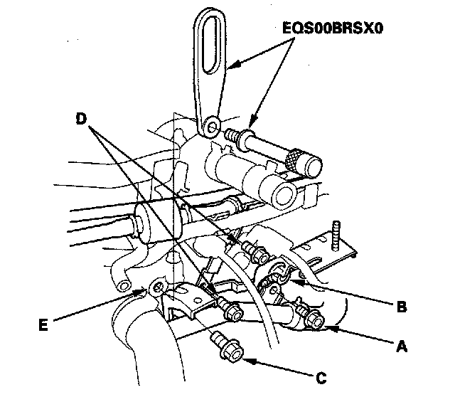 19. Remove the brake booster and EVAP line bracket mounting bolts (D), and attach the special tool to the threaded hole (E) in the cylinder head.