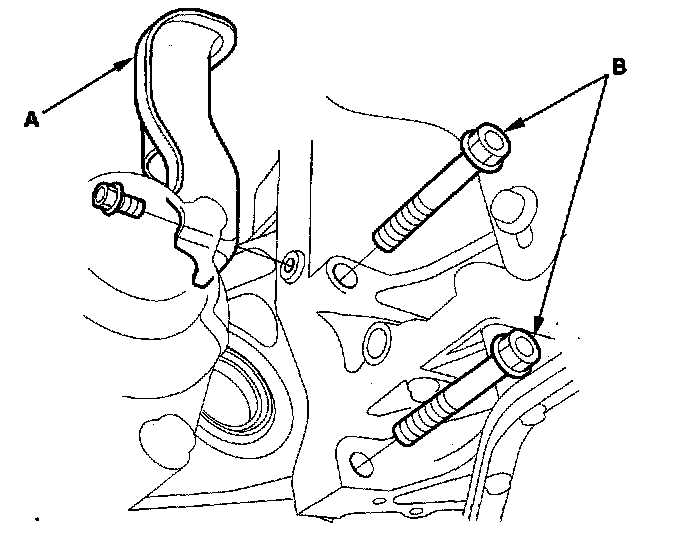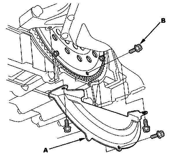 23. Remove the torque converter cover (A), and remove the eight drive plate bolts (B) while rotating the crankshaft pulley.