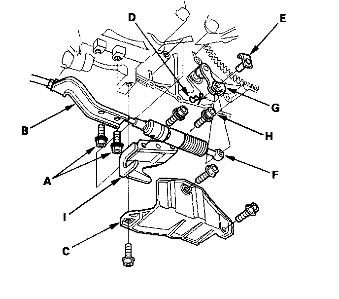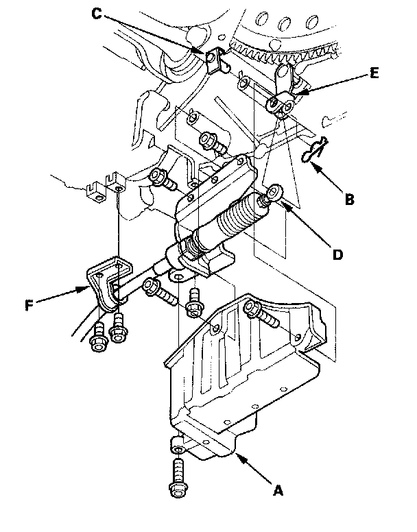 ^ 3 Remove the bolts securing the shift cable bracket (F). Do not bend the shift cable excessively.