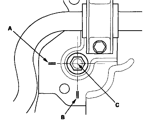 29. Make the appropriate reference lines at positions A and B that line up with the center of the subframe mounting bolts (C).