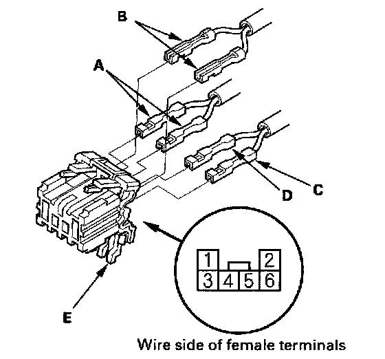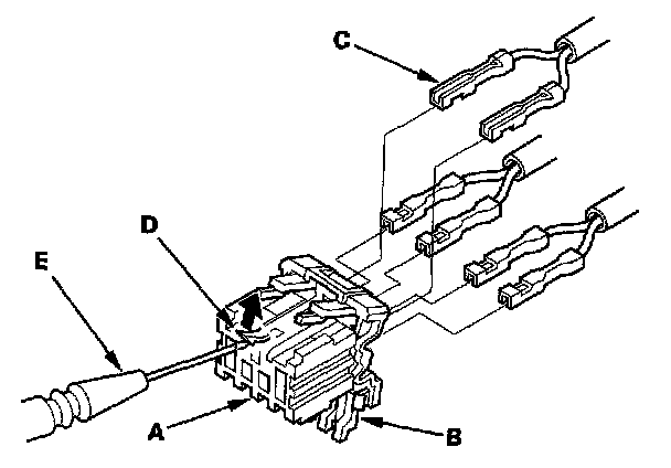 4. Remove the terminal (C) from the connector by pushing the lock tab (D) up in the connector using a thin blade screwdriver (E). Remove all six terminals.