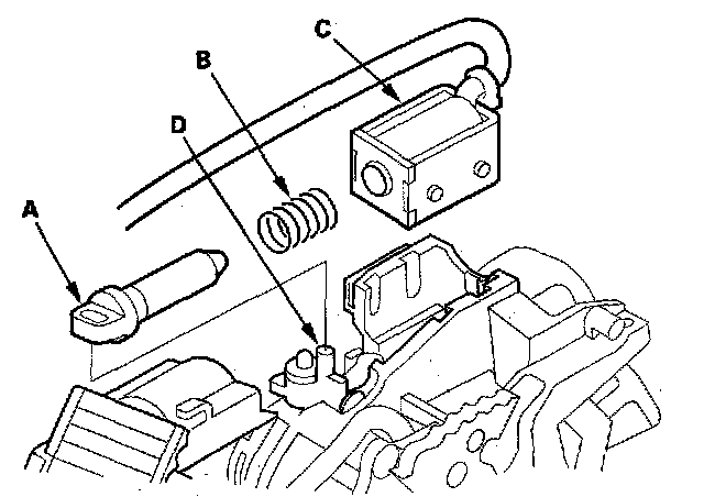 8. Install the shift lock solenoid by aligning the joint of the shift lock solenoid plunger with the tip of the shift lock stop (D).