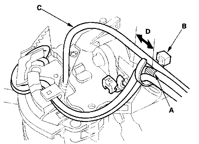 13. Align the marks (A) on the harnesses, and tie the harness band (B) over the marks. Clamp the D3 switch harness (C) 15 mm (0.6 inch) (D) from the harness band.