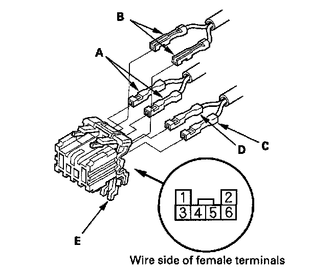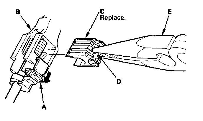 12. Remove the terminal (C) from the connector by pushing the lock tab (D) up in the connector using a thin blade screwdriver (E). Remove all six terminals.