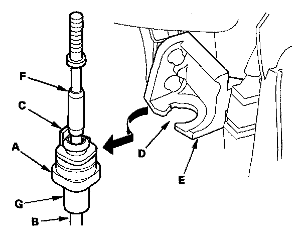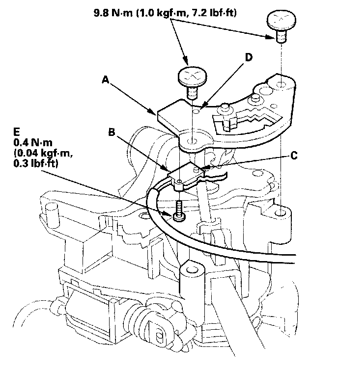 8. Rotate the socket holder (A) on the shift cable (B) a quarter turn; the tab (C) on the socket holder will be in the opening (D) of the socket holder bracket (E). Then slide the holder to remove the shift cable from the socket holder bracket.