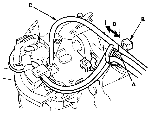 21. Align the marks (A) on the harnesses, and tie the harness band (B) over the marks. Clamp the D3 switch harness (C) 15 mm (0.6 inch) (D) from the harness band.
