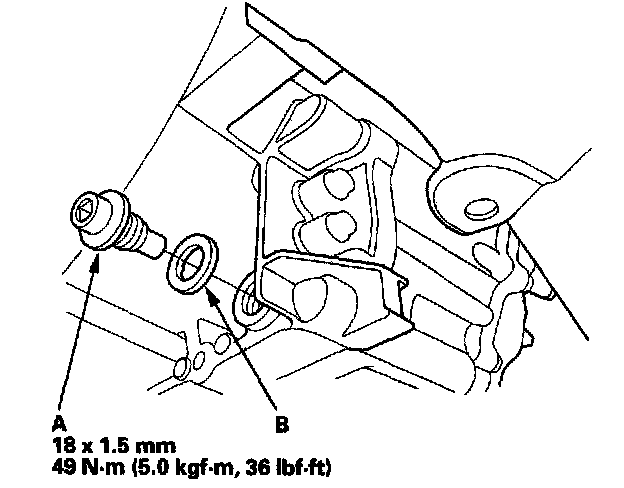2. Remove the drain plug (Al, and drain the automatic transmission fluid (ATF). Then reinstall the drain plug with a new sealing washer (B).