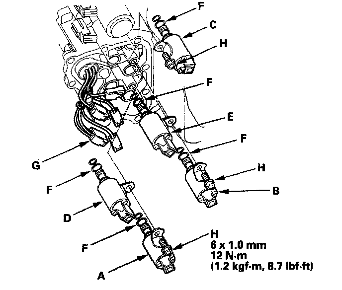 13. Install the shift solenoid valves A and B. While holding the shift solenoid valve body, be sure to install the solenoid valves until their mounting brackets contact the bracket of the installed solenoid. Install the solenoid mounting bolts (H) and tighten them.