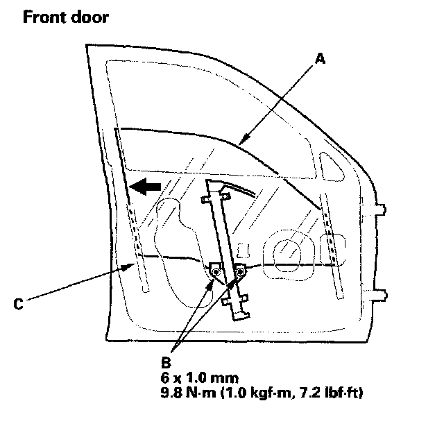 6. Raise the glass fully, and check for gaps. Also check that the glass (A) contacts the glass run channel (B) evenly.