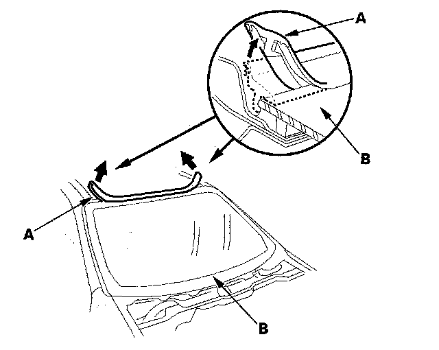 2. Remove the molding (A) from the upper edge of the windshield (B). If necessary, cut the molding with a utility knife.