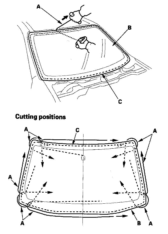6. With a helper on the outside, pull a piano wire (A) back and forth in a sawing motion. Hold a piano wire as close to the windshield (B) as possible to prevent damage to the body and dashboard. Carefully cut through the rubber dam and adhesive (C) around the entire windshield.