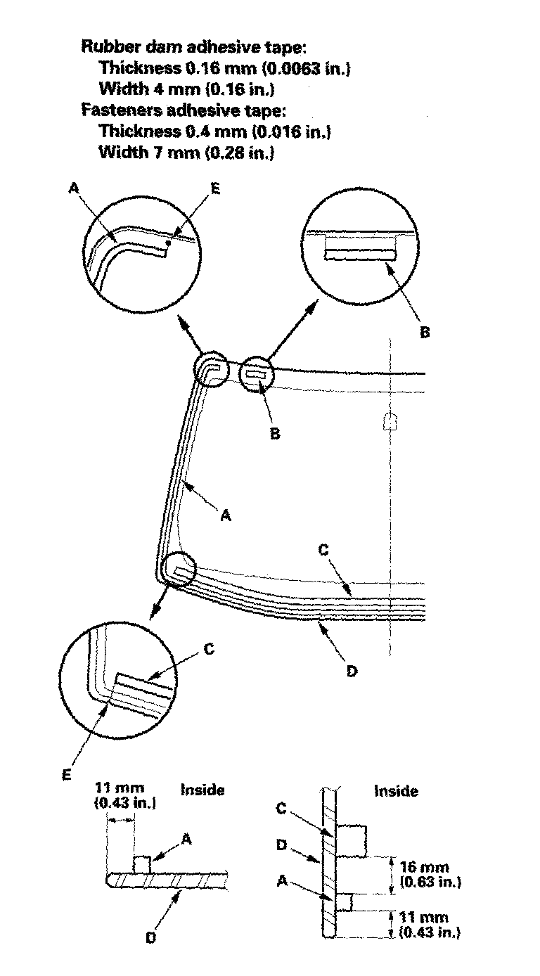 11. Attach the rubber dam (A) and the fasteners (B) with adhesive tape and dashboard seal (C) to the inside face of the windshield (D) as shown: