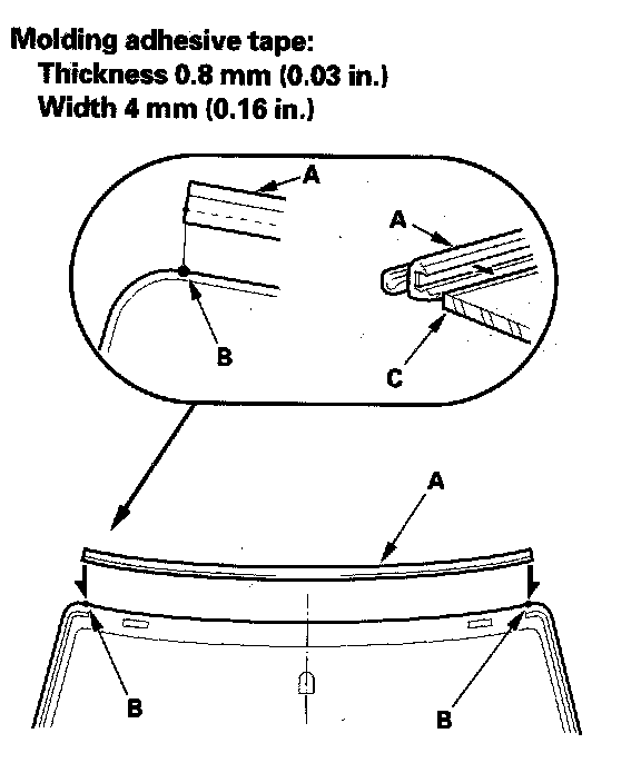 12. Align the molding (A) with the alignment marks (B), then attach it with adhesive tape on the windshield (C). Be careful not to touch the windshield where adhesive will be applied.