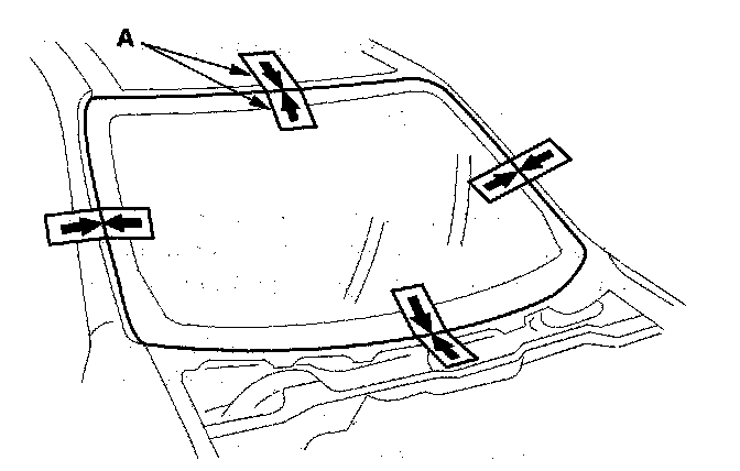 14. Set the windshield in the opening, and center it. Make alignment marks (A) across the windshield and body with a grease pencil at the four points shown. Be careful not to touch the windshield where adhesive will be applied.