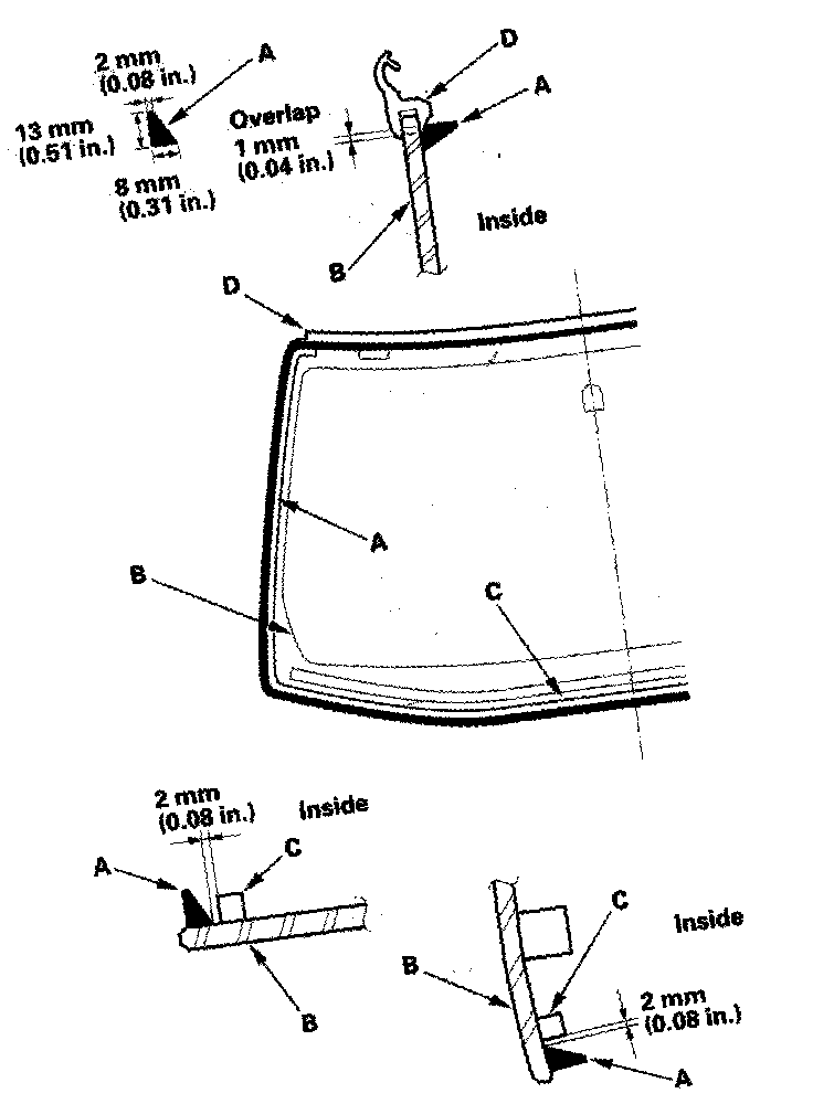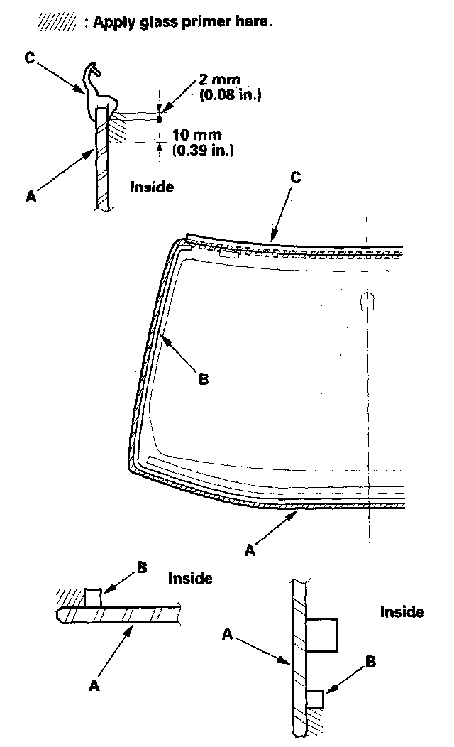 16. With a sponge, apply a light coat of glass primer around the edge of the windshield (A) between the rubber dam (B)and molding (C) as shown, then lightly wipe it off with gauze or cheesecloth: