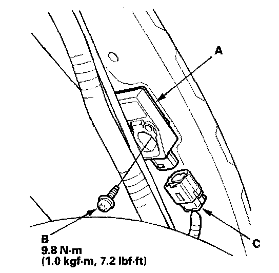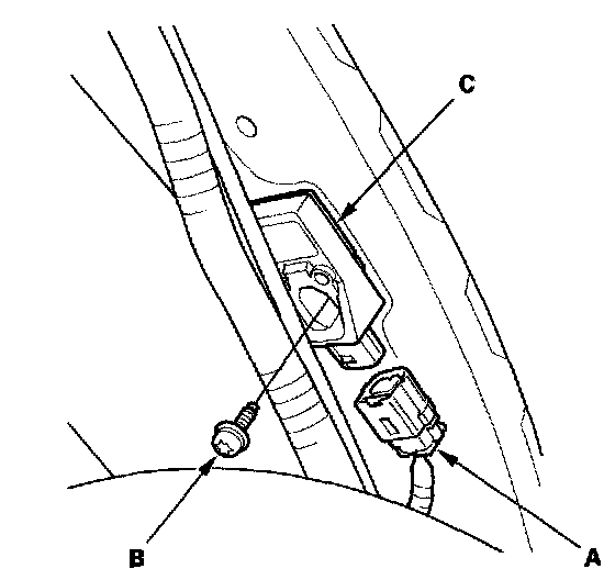 1. Install the new side impact sensor (second) (A) with a Torx bolt (B), then connect the floor wire harness 2P connector (C) to the side impact sensor (second).