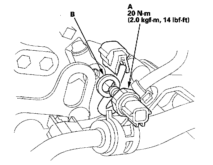 4. Install the new 2nd clutch transmission fluid pressure switch with a new sealing washer (B), and tighten the switch to the specified torque on the metal part, not the plastic part.