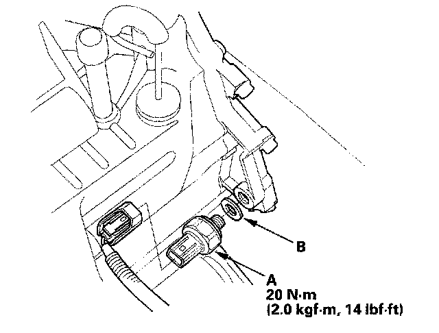 5. Install the new 3rd clutch transmission fluid pressure switch with a new sealing washer (B), and tighten the switch to the specified torque on the metal part, not the plastic part.