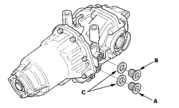 1. Remove the drain plug (A) and the oil filler plug (B) with sealing washers (C).