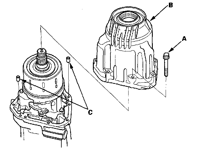 8. Remove the eight mounting bolts (A) in a crisscross pattern in several steps, then remove the torque control differential case (B) and the dowel pins (C).