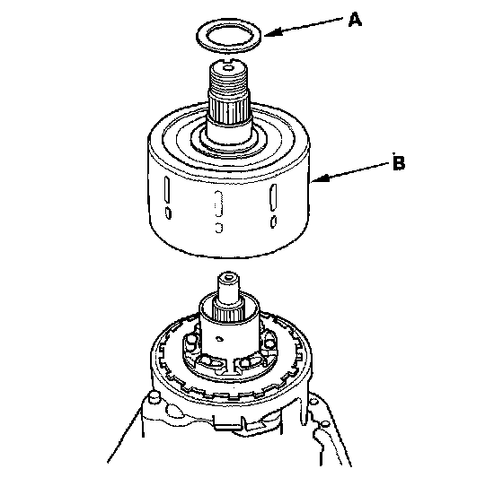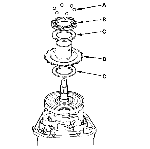 10. Remove the six steel balls (A), the base cam (B), the thrust needle bearings (C), and the pressure plate (D).