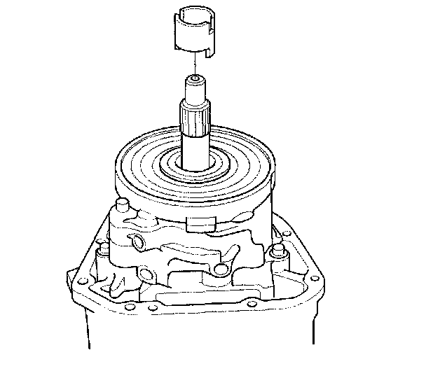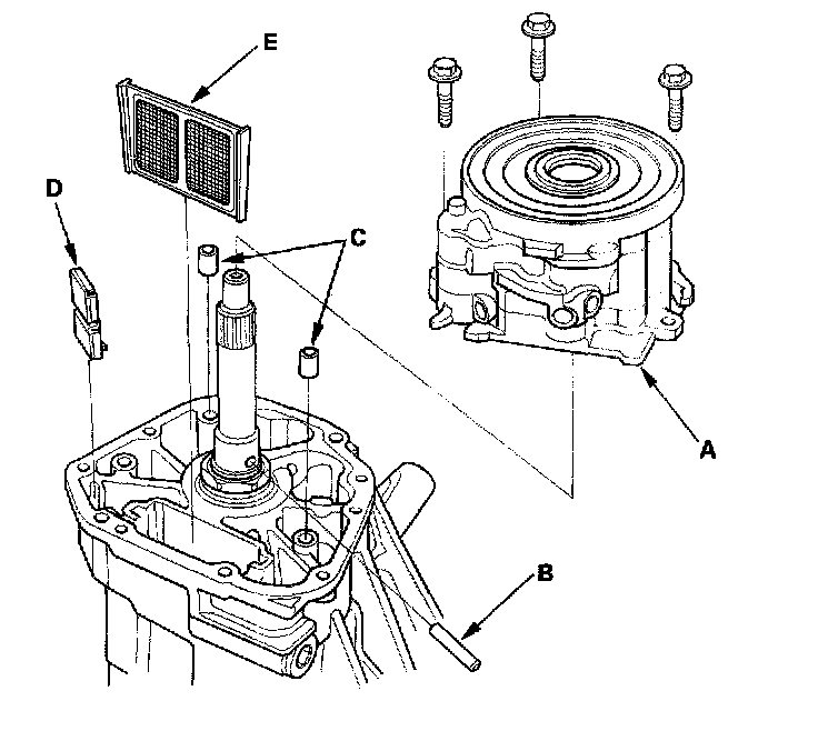 12. Remove the oil pump body assembly (A), the oil pump pin (B), the dowel pins (C), the magnet (D), and the ATF strainer (E).