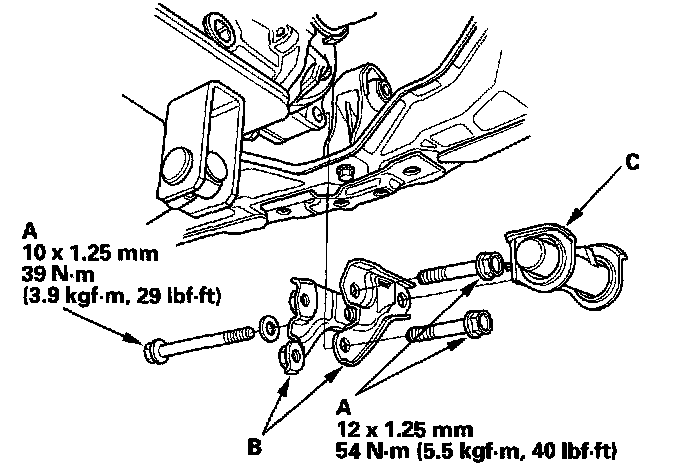 6. Install the right and left rear differential mount brackets B. then torque the bolts (A) and the damper (C).