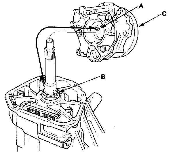 2. Align the grooves (A) of the rear oil pump with the oil pump pin (B), then install the oil pump body assembly (C) on the differential carrier assembly.
