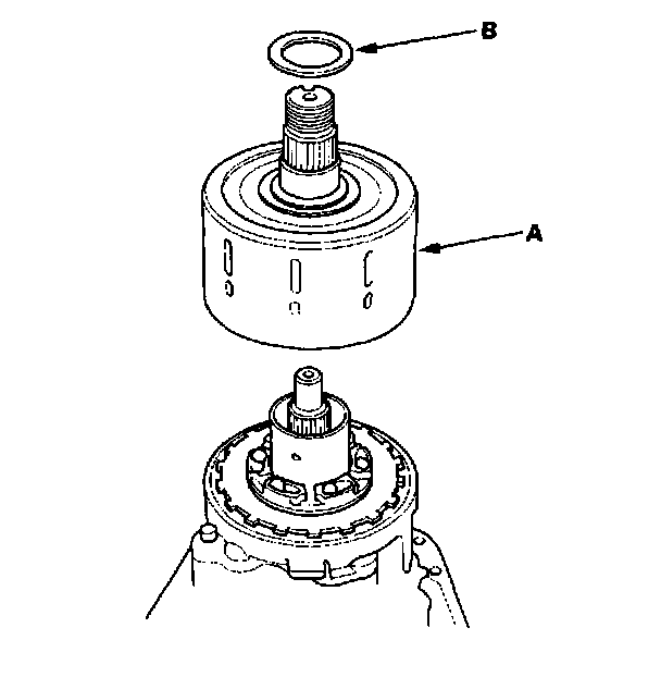 3. Install the oil pump driveshaft (A) by aligning the projection (B) of the oil pump driveshaft with the groove of the front oil pump in the oil pump body assembly.