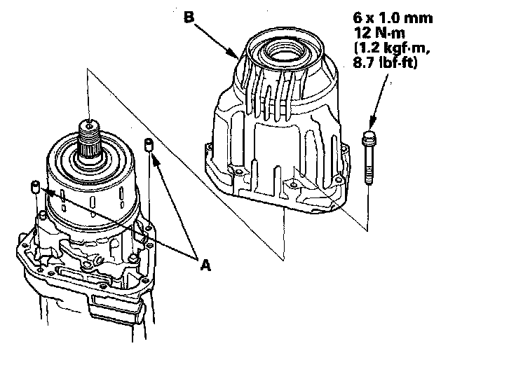 9. Install the 6 x 1.0 mm dowel pins (A) and the torque control differential case (B). Torque the eight mounting bolts in a crisscross pattern in several steps.