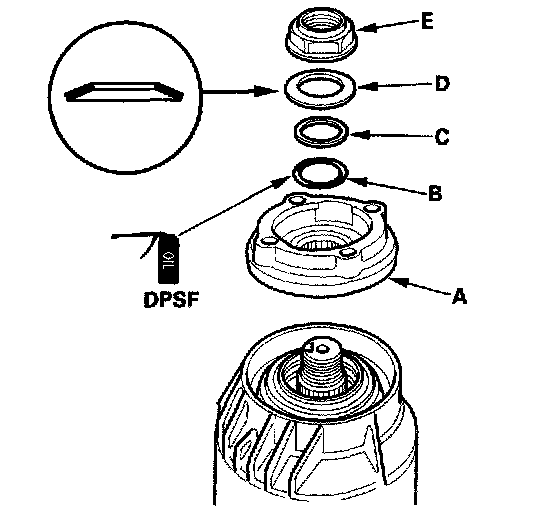 10. Install the companion flange (A), the O-ring (B), the back-up ring (C), the disc spring washer (D), and the locknut (E).