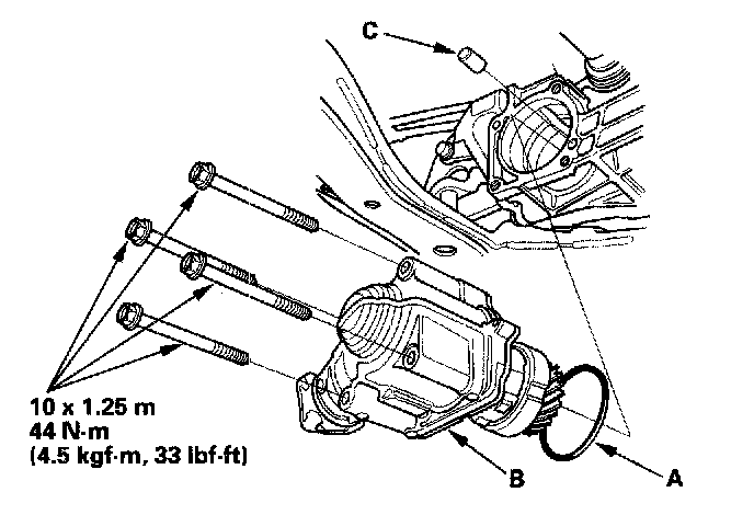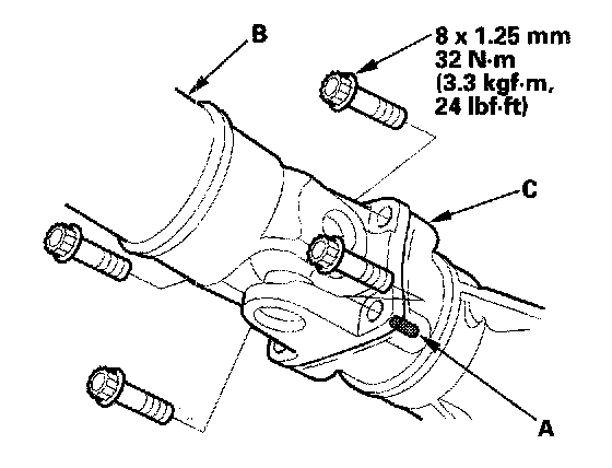 1. Install a new O-ring (A) on the transfer assembly (B), then install the dowel pin (C) on the transmission.