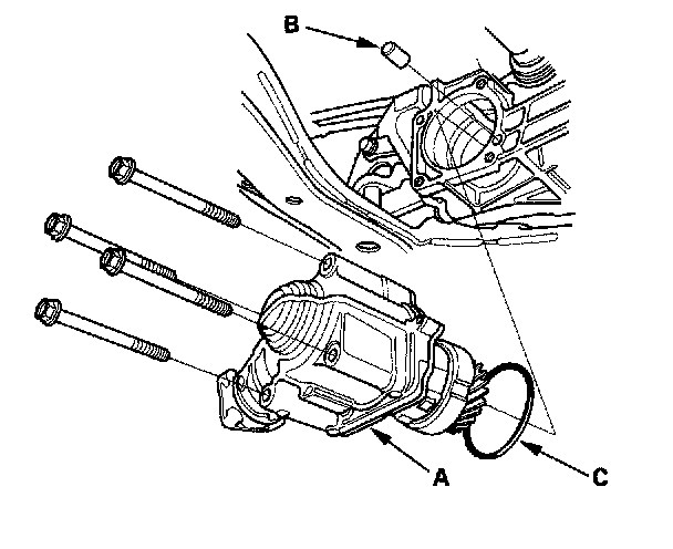 6. Remove the transfer assembly (A), the dowel pin (B), and the O-ring (C).